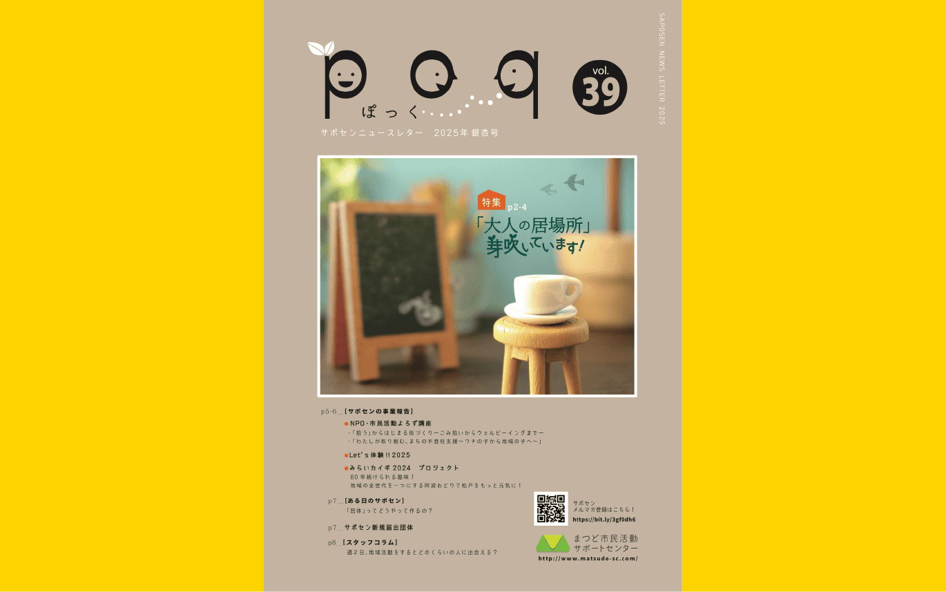 お知らせ2026.02.02ぽっく39号できました! ポスト シェア はてブ 送る コピーしました リンクをコピー ぽっく39号の配架がはじまりました。 サポセンはもちろん、市内の市民会館・公民館・図書館など公共施設に設置しています。 ぜひ手に取ってご覧ください。 こちらから内容をご覧いただけます。